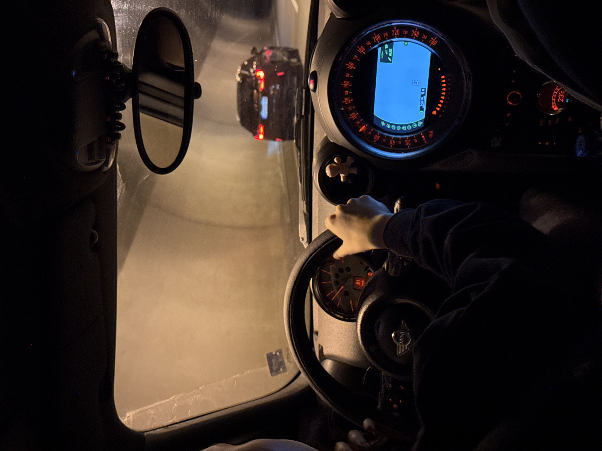 The scene is captured from the driver's perspective inside a Mini Cooper, located within a brightly lit tunnel in Blatino, Bulgaria