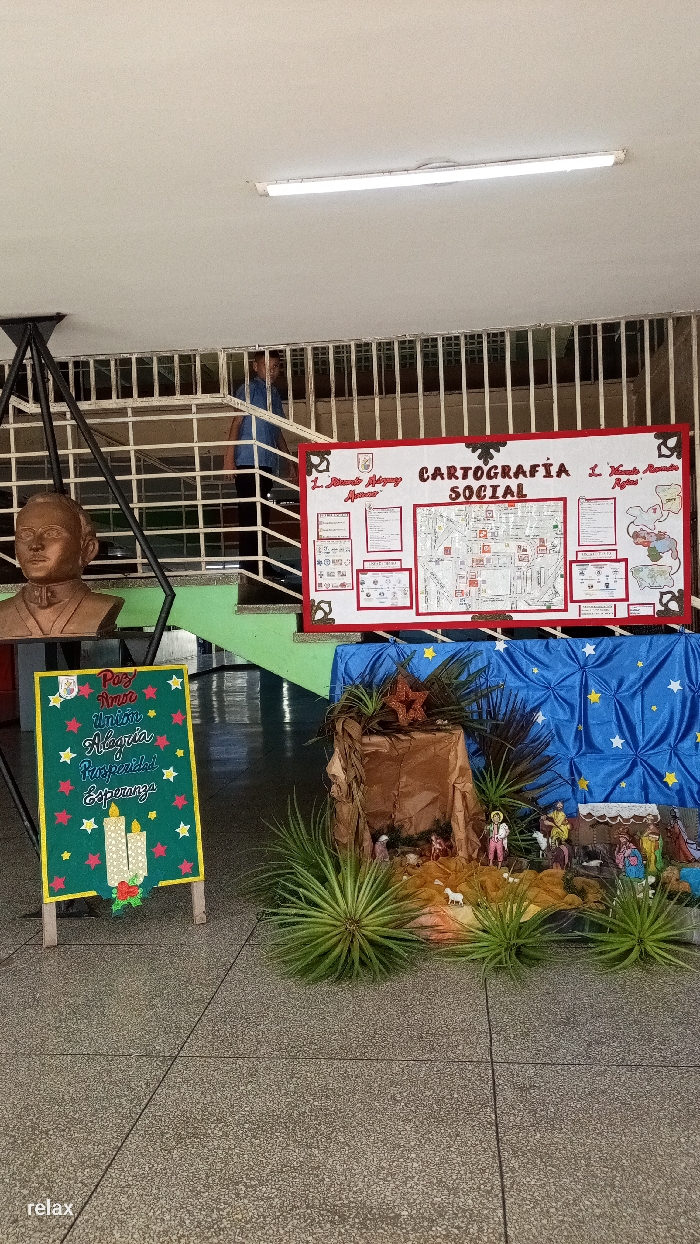 The scene is an interior hallway or common area, likely within the Liceo Vicente Maracay Aruca educational institution in Santa Ana, Venezuela. The floor is composed of light gray terrazzo tiles. In the foreground, a Christmas Nativity scene is displayed on the floor, featuring a stable constructed from brown paper and an irregular blue fabric backdrop adorned with yellow star decals. Figurines of Mary, Joseph, baby Jesus, shepherds, and various animals are present. Green, spiky potted plants flank the display, and a reddish-brown star ornament is positioned atop the stable. To the left of the Nativity scene, an easel-mounted green sign with a yellow border reads "Paz, Amor, Unión, Alegría, Prosperidad, Esperanza" in yellow lettering, surrounded by red stars and depicting two white candles with a holly motif at the bottom. Further left, a bronze-colored bust of a man in formal attire is situated on a dark hexagonal stand. In the midground, a large rectangular white board with a prominent red border is visible. Titled "CARTOGRAFÍA SOCIAL" (Social Cartography), it features a detailed map, textual information, and diagrams. The text "L. Vicente Maracay Aruca" is discernible on this board, confirming the institutional context. The background reveals a green-painted staircase leading to an upper level, separated by white metal railings. A single individual wearing a blue shirt is partially visible behind these railings on the upper landing. The ceiling is white, with a single, long fluorescent light fixture illuminating the area.