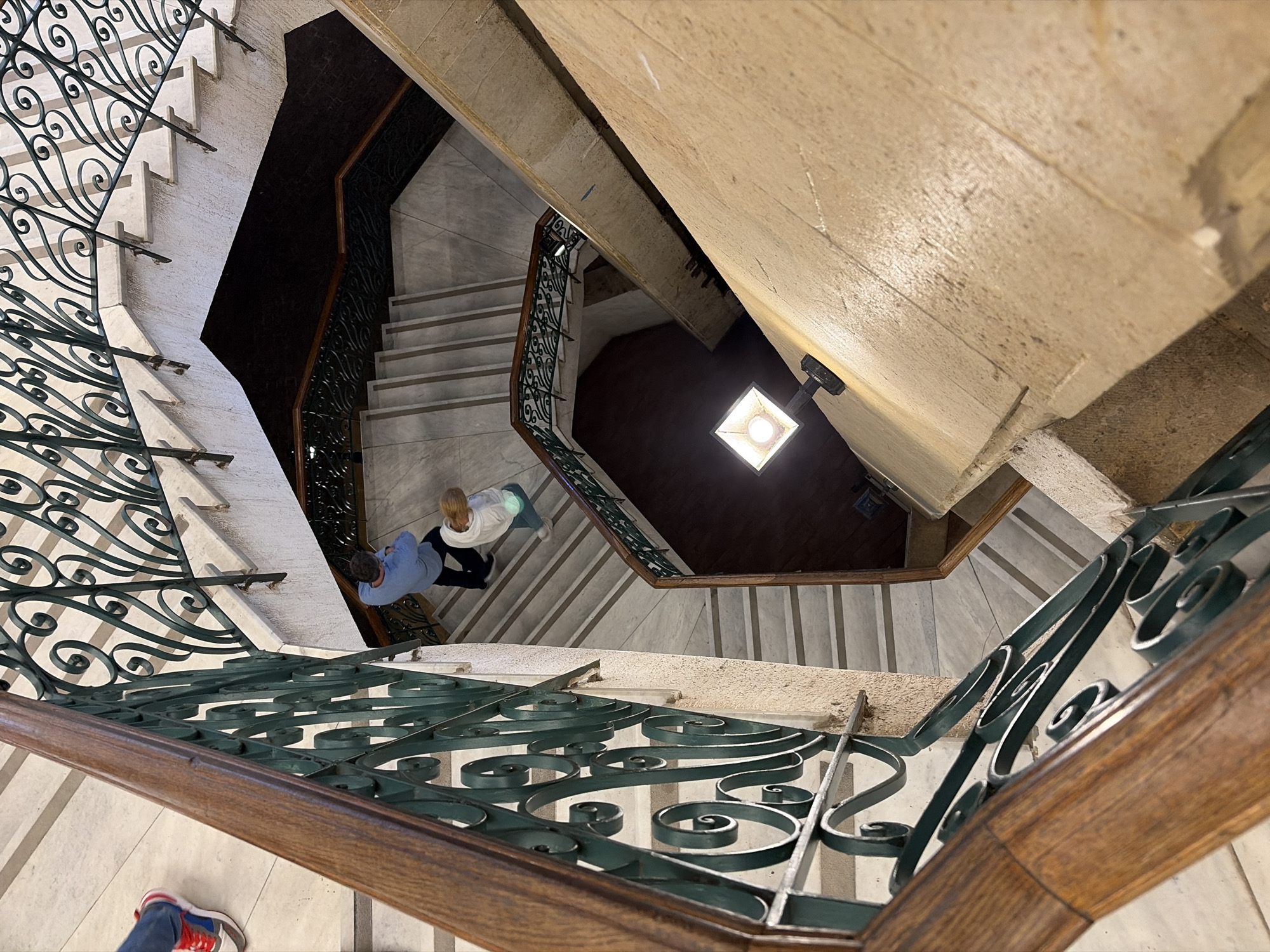 An overhead, angled shot captures the interior of a multi-story building in Sharm El Sheikh, Egypt. The focal point is a winding staircase with marble steps and dark green wrought iron railings accented with a wooden handrail. Two individuals are seen on the stairs: a person in a light blue shirt and another in a white sweatshirt and dark pants. The central core of the staircase is dark with a single light fixture. The perspective suggests the photo was taken from a higher level. A pair of feet wearing blue jeans and red, blue, and grey athletic shoes is visible in the foreground.