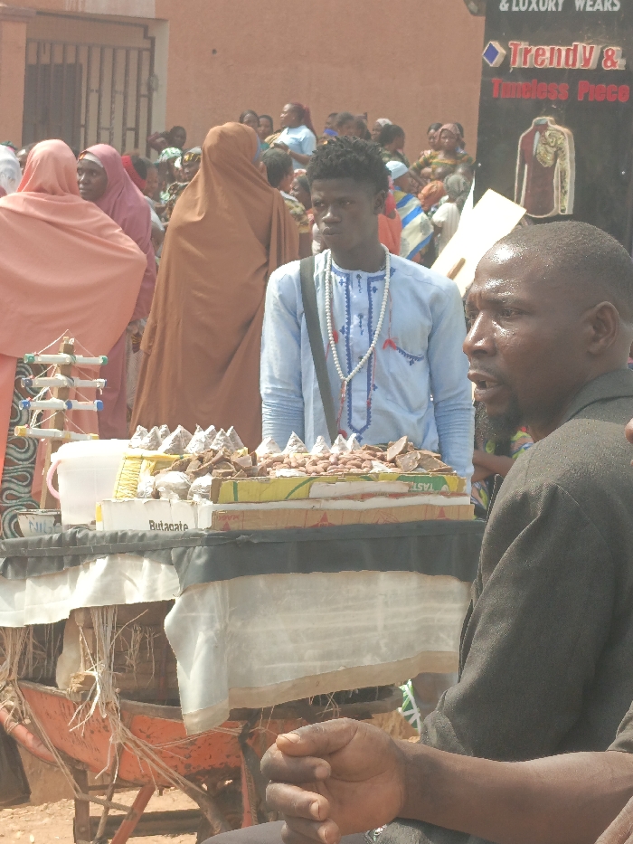 This image depicts a bustling outdoor street or market scene in Ube, Nigeria. In the foreground, an adult male with dark skin, short dark hair, and a trimmed beard is visible from the chest up, facing left in profile. He wears a dark shirt or jacket, and his mouth is slightly agape. His right hand is partially clenched in the lower right corner. Behind him, in the midground, stands a young dark-skinned male with short, textured dark hair. He wears a light blue long-sleeved garment with dark blue embroidery around the neck and chest, adorned with multiple strands of white beaded necklaces. He gazes slightly to his left, with a dark strap visible over his left shoulder. He is positioned behind a mobile vendor stall, which appears to be constructed on an orange wheelbarrow frame, draped with dark and white fabric. The stall displays various items for sale: conical, light-colored objects arranged in rows; numerous irregularly shaped brown lumps; and a collection of oval-shaped, light brown nuts. These items are presented in cardboard boxes, one of which is partially labeled "Butagate." A white plastic jug and a multi-spindled display holding small, colorful items (possibly thread spools or similar products) are also on the stall. In the background, a crowd of individuals, predominantly women wearing various head coverings, including peach/light orange and brown hijabs, are gathered or moving. A light brown building with a barred window is visible on the far left. To the upper right, a partially visible dark commercial sign advertises "& LUXURY WEARS" and "Trendy & Timeless Piece," featuring a diamond graphic and a clothing illustration. The ground appears to be unpaved earth. The scene is illuminated by daylight.