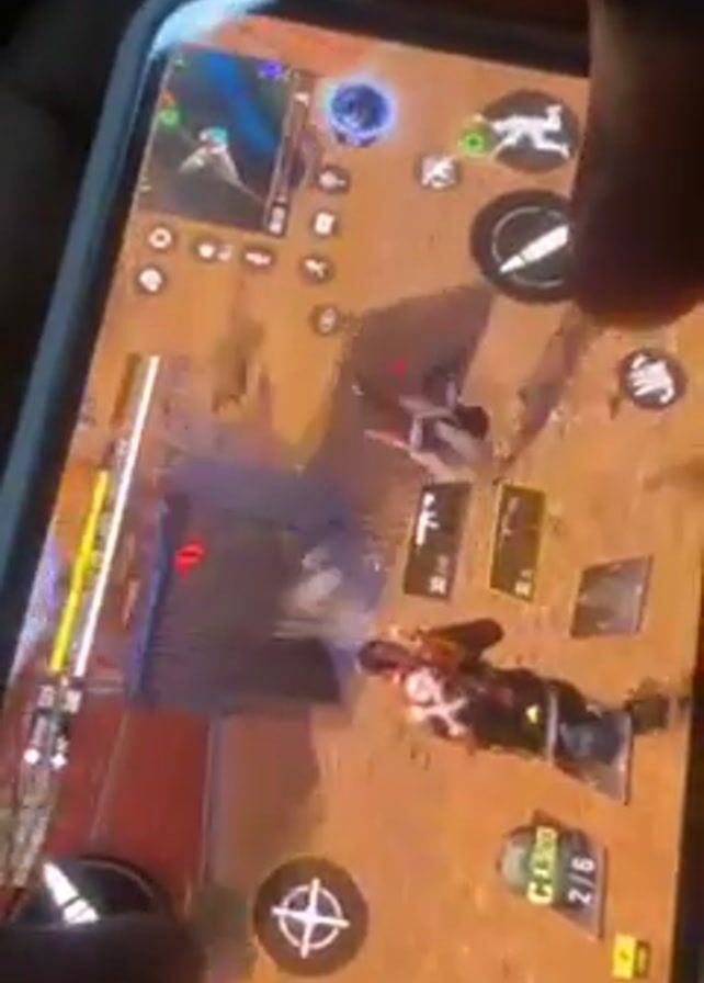 A person is holding a smartphone and playing a first-person shooter video game. The game is set in a desert-like environment. The player is controlling a character who is shooting at other characters. The player's fingers are visible on the screen, controlling the character's movements and aiming. The game interface includes a mini-map, health bar, ammunition count, and other in-game elements. The game screen is bright and colorful. The video is shot from a close-up perspective.