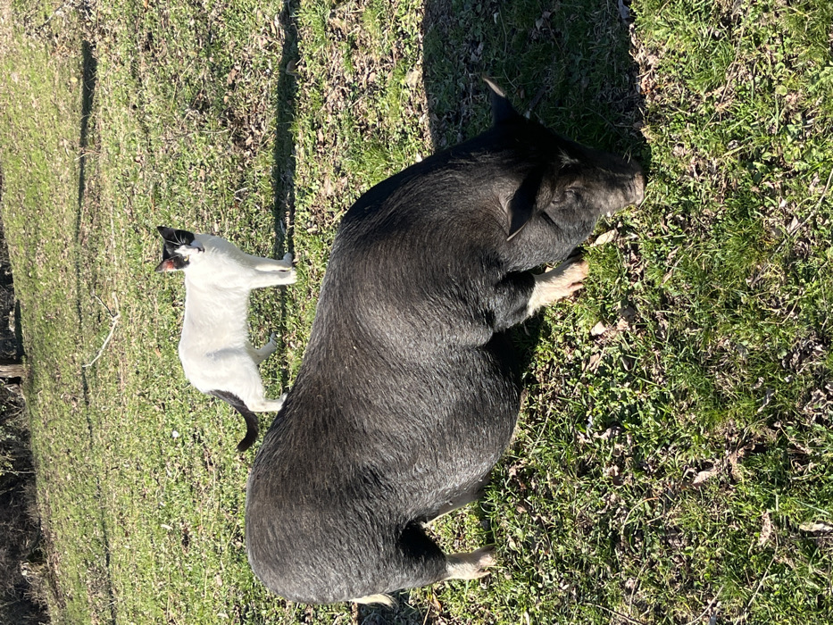The image portrays an outdoor scene in the city of Škaljari, Montenegro. In the foreground, a large, dark-pigmented pig is seen with its head lowered, actively rooting or grazing in a patch of green grass mixed with dried leaves and soil. The pig's body is predominantly dark, with lighter hooves visible. Positioned behind and to the left of the pig, a domestic cat stands erect on all four paws, facing directly towards the viewer. This cat has a white body, black ears, distinct black markings around its eyes and nose, and a black tail. The ground is covered in green grass, with visible areas of brown dirt and sparse vegetation. The background features blurred trees and shrubbery under bright daylight, casting subtle shadows on the ground.