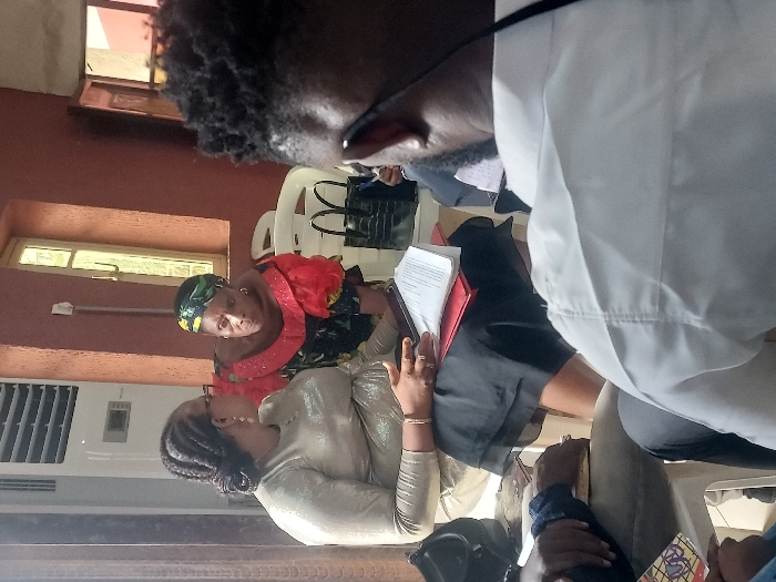 The image displays an indoor scene within a communal or meeting space located in Obosi, Nigeria. The specific street-level or building identification within Obosi is not discernible. In the foreground, the back of a male individual's head and right shoulder are prominently visible, occupying the lower right and central portions of the frame. He has short, dark, curly hair and wears a white collared shirt, with the earpiece of black eyeglasses visible over his right ear. His head is turned slightly to the left. In the midground, two women are seated on white plastic chairs, engaged in a direct interaction. The woman on the left wears a shimmering, light-colored, long-sleeved top and a dark skirt. Her dark hair is styled in braids and pulled back. She wears eyeglasses and multiple bracelets on her left wrist. Her hands are clasped over a tablet or smartphone, a red folder, and loose papers resting on her lap. She is looking towards the woman on her right. The second woman, positioned to the right of the first, wears a multi-colored headwrap with green, yellow, and black patterns. Her top features prominent red, ruffled sleeves and an orange-red neckline, with a darker, patterned body. She is leaning slightly forward and looking intently at the first woman. A black handbag is visible on a white plastic chair positioned behind her. The background consists of reddish-brown walls. A white vertical air conditioning unit is mounted on the wall to the left. A rectangular window with light-colored frames is visible on the right wall. The room is furnished with several white plastic chairs, one of which is partially occupied by another individual, whose arm and leg are visible in the lower-left corner. The lighting in the scene is consistent with an indoor environment, likely a combination of natural light from the window and artificial illumination.