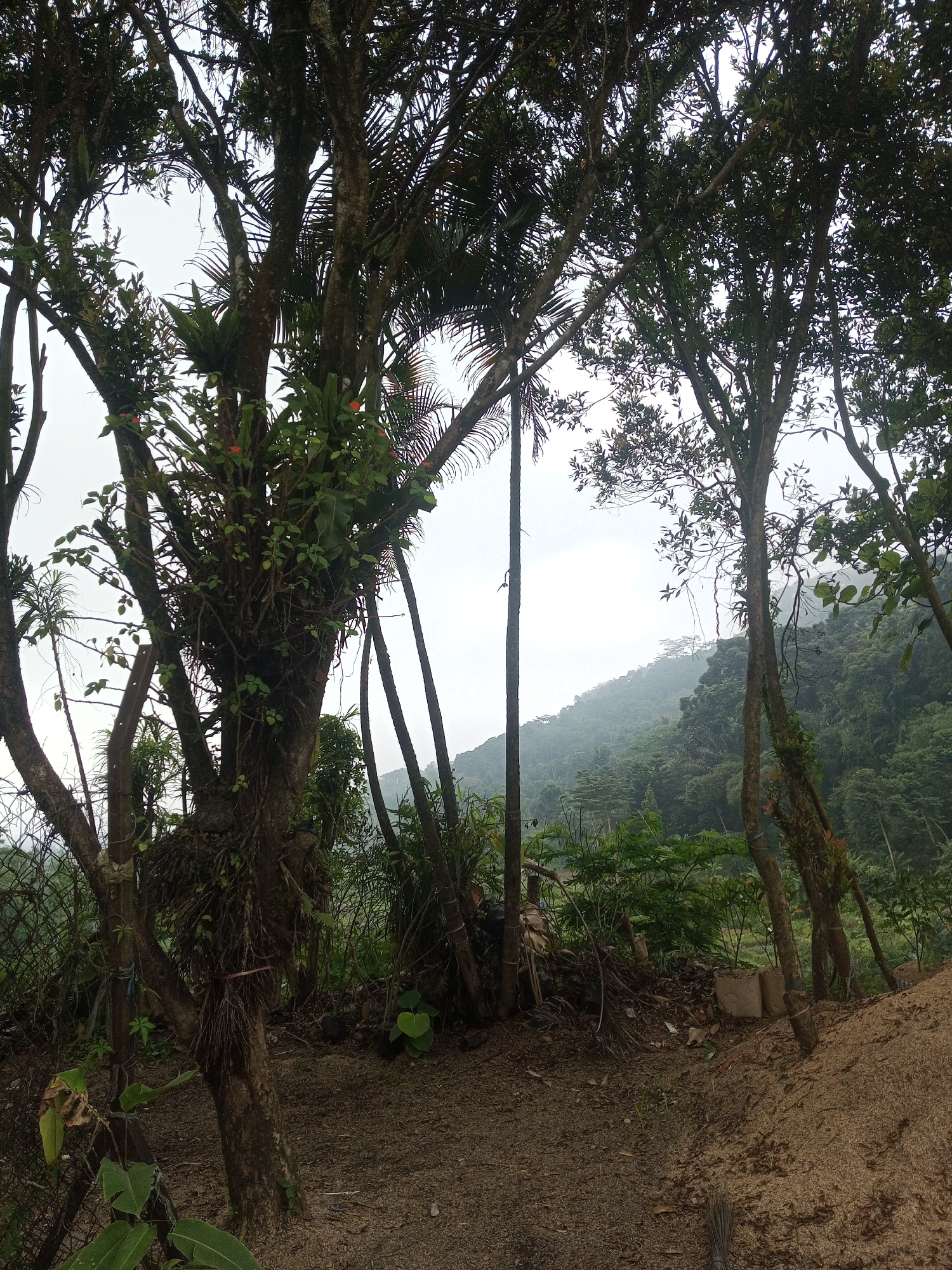 The image displays a natural, overgrown outdoor scene in Kan Beit, Myanmar, under an overcast, light-grey sky. The foreground consists of dark brown soil on the left, transitioning to a substantial mound of lighter tan-colored, coarse organic material, resembling sawdust or rice husks, on the right. A small bundle of dark, thin sticks is visible on the ground at the bottom center. A section of a rust-colored chain-link fence, partially obscured and intertwined with green foliage, is present on the lower left. The midground is dominated by numerous tree trunks and dense vegetation. A prominent central tree features a thick, gnarled trunk heavily colonized by green vines, various epiphytic plants with broad leaves, and small clusters of orange flowers. Other trees with dark, slender trunks and dense green canopies, along with several tall, thin, palm-like structures, are distributed across the frame. Behind these, a lower layer of dense green foliage extends towards the background. The background reveals a range of densely forested hills or mountains, receding into a light atmospheric haze, characteristic of a humid, elevated landscape. No human figures, animals, or direct signs of ongoing human activity are visible within the frame.