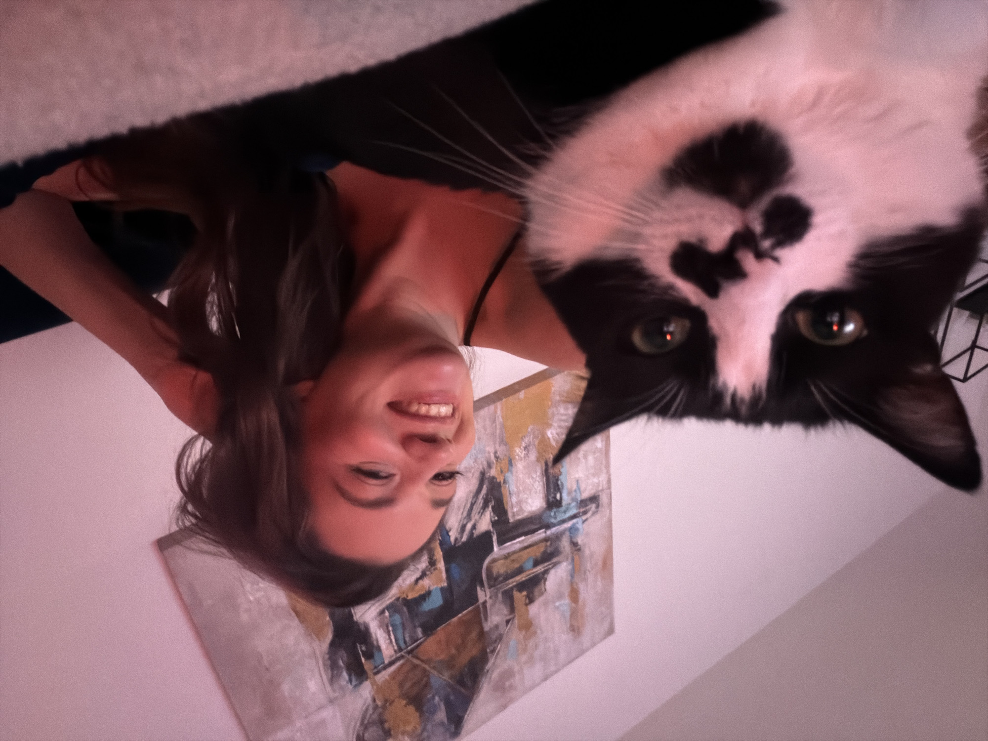 A woman with brown hair and a black camisole is positioned upside down, smiling at the camera. A black and white cat is also upside down, its face close to the lens. In the background, an abstract painting hangs on a white wall. The location is potentially a domestic setting, but there is not enough information to identify the location in Belgrade, Serbia.