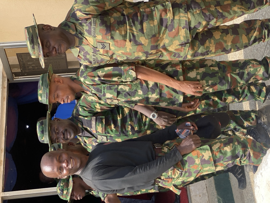 The image depicts five adult males standing outdoors in Kachia, Nigeria, in daylight conditions. The man on the far left, in the foreground, wears a black long-sleeved shirt and camouflage trousers with black shoes, smiling and looking towards the camera. He holds a black cap and a plaid fabric in his hands. Behind him, another man in a Nigerian Army camouflage uniform with a boonie hat is also smiling towards the camera. Three other men are visible to the right, all in Nigerian Army camouflage uniforms. Two of them wear boonie hats, while the man on the far right wears a camouflage peaked cap. Uniform details include "NIGERIAN ARMY" patches and rank insignia; the man on the far right has two chevron stripes and a name tag reading "SANI D." A light-colored building wall serves as the backdrop, with blue and possibly red fabric visible through a doorway in the background. The ground is light-colored, likely concrete.