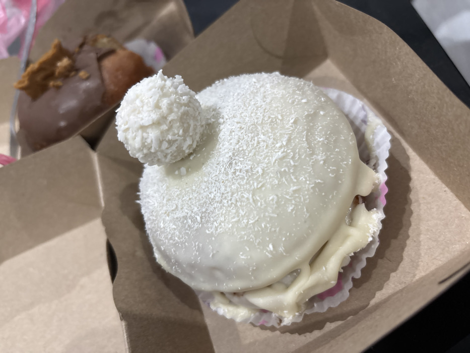 The image displays two desserts contained within an open, light brown cardboard takeaway box, located in Slavyanovo, Bulgaria. In the foreground, a round pastry is covered with a thick layer of white frosting and generously sprinkled with shredded coconut. A smaller, spherical coconut confection, also coated in shredded coconut, is positioned centrally on top of the round pastry. This primary pastry rests within a white fluted paper liner, which is supported by an underlying pink fluted paper liner. In the upper right background, a second, elongated pastry is visible, appearing out of focus. This secondary pastry is covered in brown chocolate frosting and topped with irregularly shaped, light brown crumbles, resembling crushed biscuits or nuts. The immediate environment is the interior of the cardboard box, with its textured, unbleached paperboard walls visible. No individuals or specific actions are depicted.