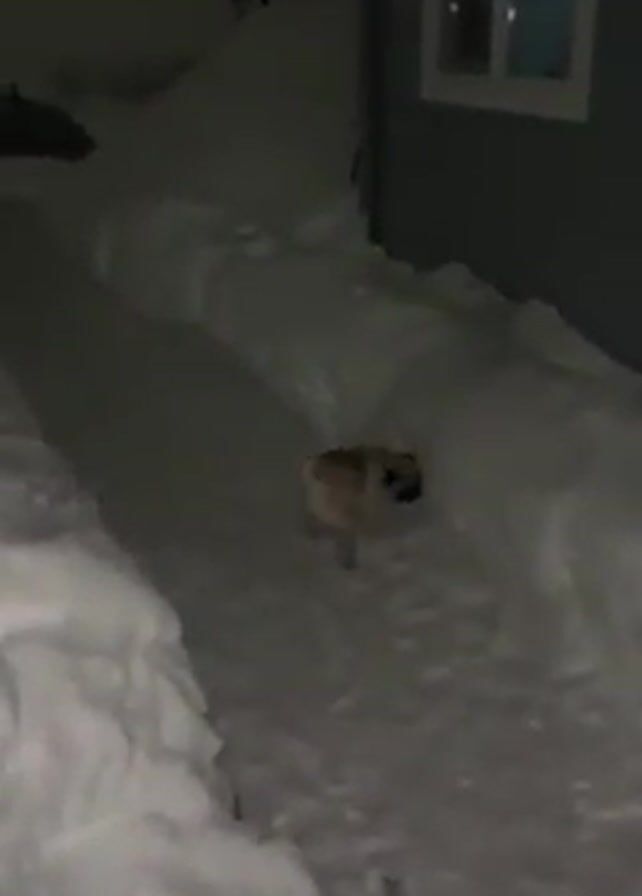 A short video shows a pug walking in the snow at night