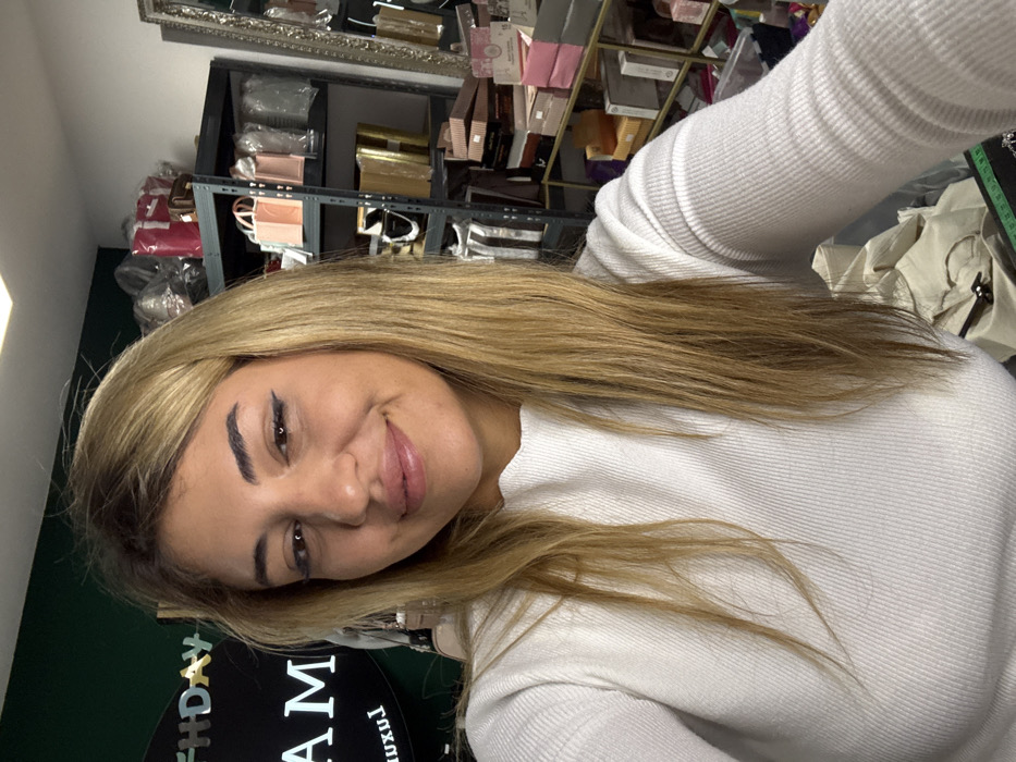 A woman with honey-blonde hair smiles in a selfie. She is wearing a white, ribbed top. Behind her, shelves display an assortment of packaged goods, possibly cosmetics or accessories. A circular sign with text, partially obscured, is visible on the lower left. The room seems to be an organized storage or workspace.