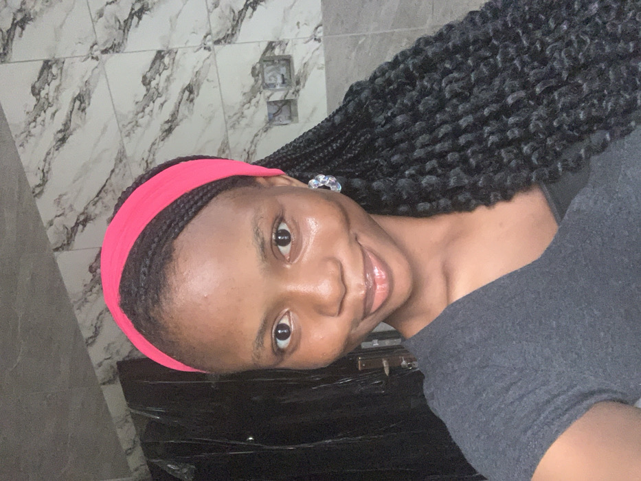 A young woman with dark skin and braided hair is shown wearing a pink headband and silver earrings. She is smiling slightly and looking directly at the camera. Her shirt is gray. She appears to be in a bathroom with a marble-patterned wall behind her. A black surface, likely a sink or counter, is visible below. The image has been rotated counterclockwise, creating a slight tilt.