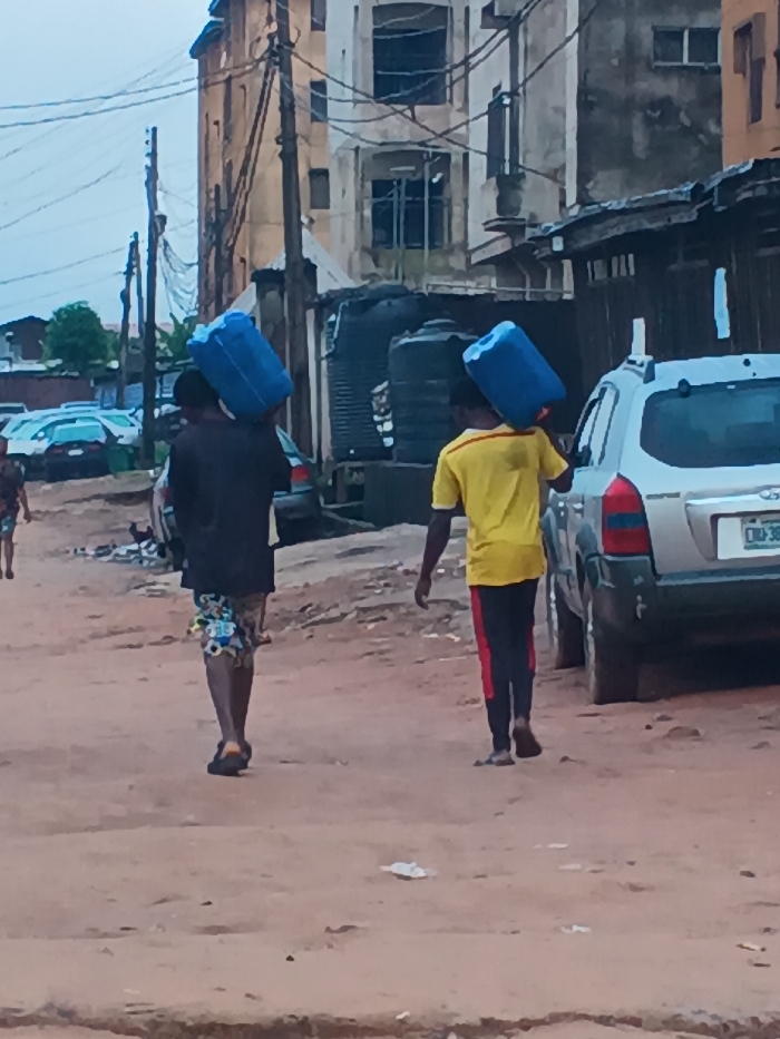 The image depicts a street scene in Onitsha, Nigeria, under an overcast sky. Two individuals are prominently featured in the mid-ground, walking away from the camera on an unpaved, reddish-brown dirt road. Both are carrying large, blue plastic jerrycans balanced on their heads. The person on the left wears a dark long-sleeved shirt, patterned shorts, and dark sandals. The individual on the right wears a yellow short-sleeved shirt with red shoulder stripes, dark pants with red side stripes, and dark footwear. A third person is partially visible further down the road on the far left. To the right, a silver SUV, possibly a Hyundai Tucson, with a visible license plate reading "EMU 306" followed by obscured characters, is parked. Behind the SUV and extending further down the street are multiple large, black cylindrical water storage tanks. The background features several multi-story buildings in various states of repair, exhibiting exposed concrete and weathering. Numerous utility poles with extensive networks of overhead electrical and communication wires crisscross the upper portion of the frame. Additional parked vehicles are visible in the distant background on the left. The ground shows scattered debris.