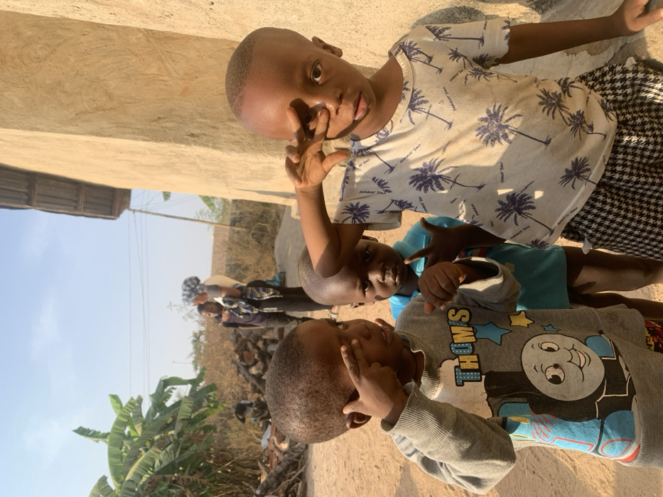 This image depicts an outdoor scene in Garaku, Nigeria, under clear, bright daylight. Three young children are positioned in the foreground, facing the viewer. The child on the left, wearing a grey long-sleeved shirt featuring a "THOMAS" graphic, has their right hand raised with the index and middle fingers covering their right eye. The central child, dressed in a light blue short-sleeved shirt, has their left hand forming a gestural shape near their waist and looks directly forward. The child on the right, wearing a white short-sleeved shirt with a dark palm tree pattern and black and white checkered shorts, holds their right hand to their face, with the thumb and index finger forming a circle around their right eye. In the mid-ground, to the left of the children, two adult figures are partially visible. One adult, appearing to be a woman with a patterned head covering, is carrying an object or bundle on her back. The second adult stands partially behind her. The immediate ground is dry, light brown earth. To the right, a segment of a light-colored, possibly mud or concrete, building wall is visible, topped by a corrugated metal roof section. In the left background, large green banana leaves, dry vegetation, and a pile of cut wood are present. The sky above is clear and light blue.