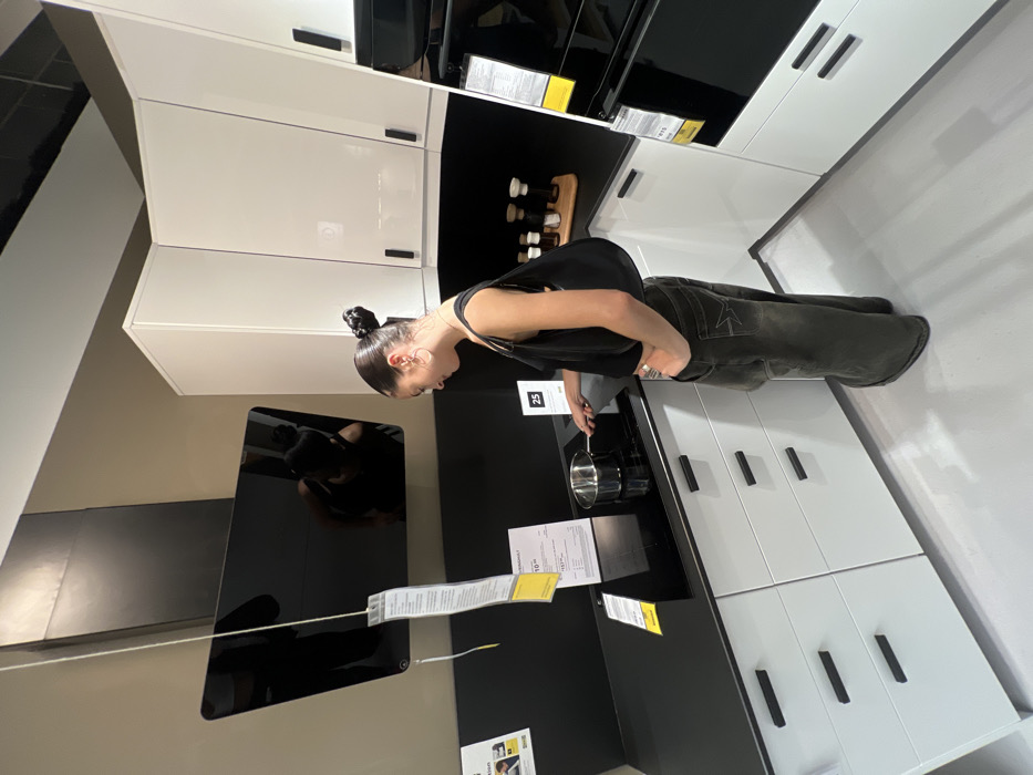 The image displays a modern kitchen showroom setup within what is identified as IKEA Brighton, located at Brighton Road, Lancing, United Kingdom. A single individual, appearing female, stands in profile, facing a black induction stovetop. She has dark hair styled in a high bun and is wearing hoop earrings, a black sleeveless crop top, and dark, wide-leg trousers. Her left hand rests on her hip, while her right hand is extended towards a small stainless steel pot positioned on the stovetop, suggesting interaction or inspection. The kitchen display features white, glossy upper and lower cabinets with black bar handles. A black countertop and splashback surround the stovetop area. Above the stovetop is an angled black glass kitchen hood, which reflects the individual's upper body and partially another person's legs. To the right, a black built-in oven unit is integrated into white cabinetry. On the countertop in the corner, a small wooden tray holds several small bottles or jars. Various yellow and white product information tags are visible, one displaying "25" and another partially visible with "10.99" and "RENAULT" text. The floor is a light, neutral color, reflecting some light.