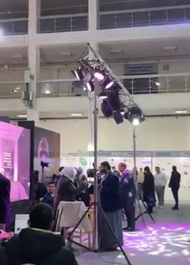 scene at an indoor event, possibly a conference or trade show. There's a lighting rig with multiple spotlights pointed downwards, illuminating a small gathering of people. A woman wearing a hijab is holding a camera and appears to be filming or interviewing a man in a dark suit and a light-colored thawb. Another man in a suit stands nearby. In the background, other attendees can be seen walking around, and there are various display booths. A large screen shows a 3D graphic with purple lighting. The general environment looks like a convention center or a large event hall.