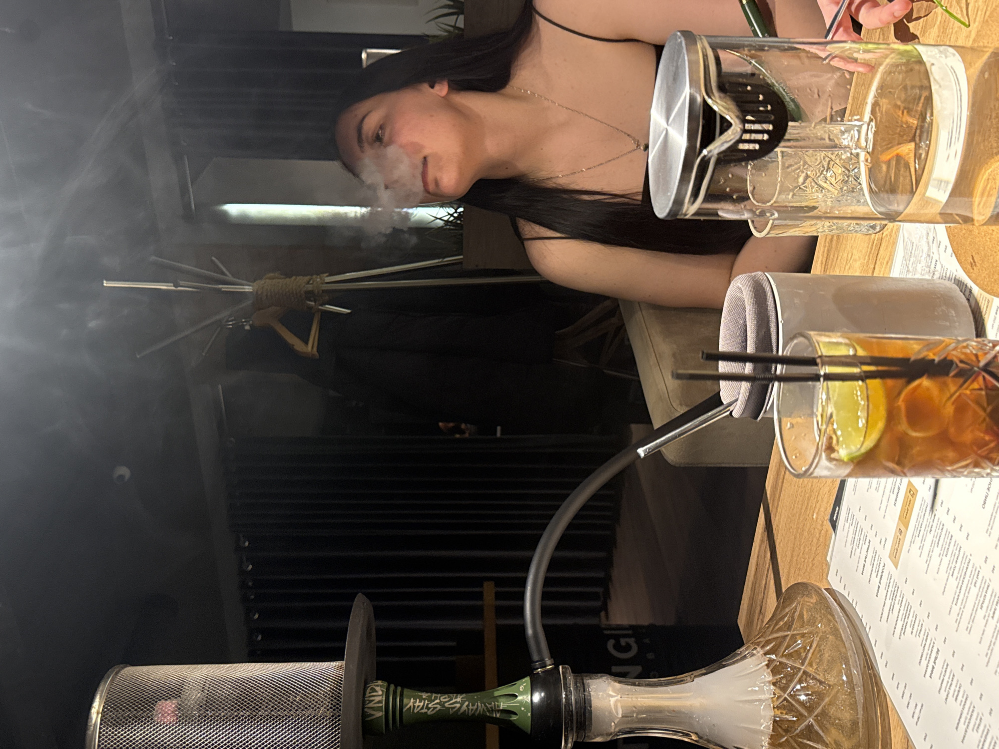 A young woman with long, dark hair exhales smoke. The scene is indoors, illuminated by warm artificial lighting. In the foreground is a hookah, with a metal and glass base and a flexible hose leading to a mouthpiece. A glass of a cocktail with a slice of lime and two straws stands next to the hookah on a wooden table, along with a menu and a clear glass of water. Based on the location information, this is likely in the city of Chaikovsky, Russia.