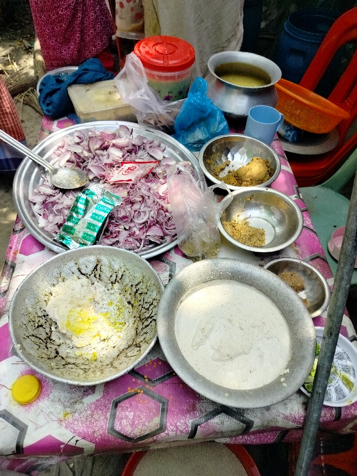 The scene depicts a table covered in a pink and white patterned tablecloth with a variety of food items. A large platter of chopped red onions is at the center, with a spoon and two packets of something next to it. On the left, there is a bowl containing white paste with yellow flecks and a small, yellow lid. To the right, a larger bowl with white, creamy liquid is shown. There are three additional small bowls: one containing brown powder, one with lighter brown powder, and one with brown specks. A blue plastic bag and a red plastic container are also visible. The image is taken in Lalmohan, Bangladesh at a location with coordinates 22.36 latitude and 90.765 longitude.
