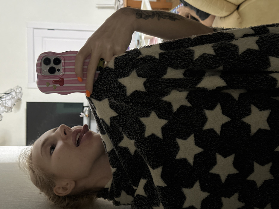 An indoor scene in Novosergievka, Russia, depicts a female subject taking a selfie. The subject, positioned on the left side of the frame, has light blonde hair, fair skin, and is looking upward and to the right, extending her tongue. She is wrapped in a dark-colored, fuzzy blanket adorned with numerous light-colored star patterns. Her right hand, with bright orange nail polish and a ring featuring a clear stone on her ring finger, holds a smartphone up to capture the image. A tattoo of floral design is visible on her right forearm. The smartphone case is pink with white vertical stripes and features a prominent red stylized phallic emblem alongside two small green hearts; the phone's triple-lens camera array is visible. In the background, a light-colored wall is visible, along with a dark-screened television, a white door frame, and a geometric-shaped ceiling light fixture. A section of a light-colored sofa or armchair is visible on the far right, with a dark-clothed limb or object resting upon it.