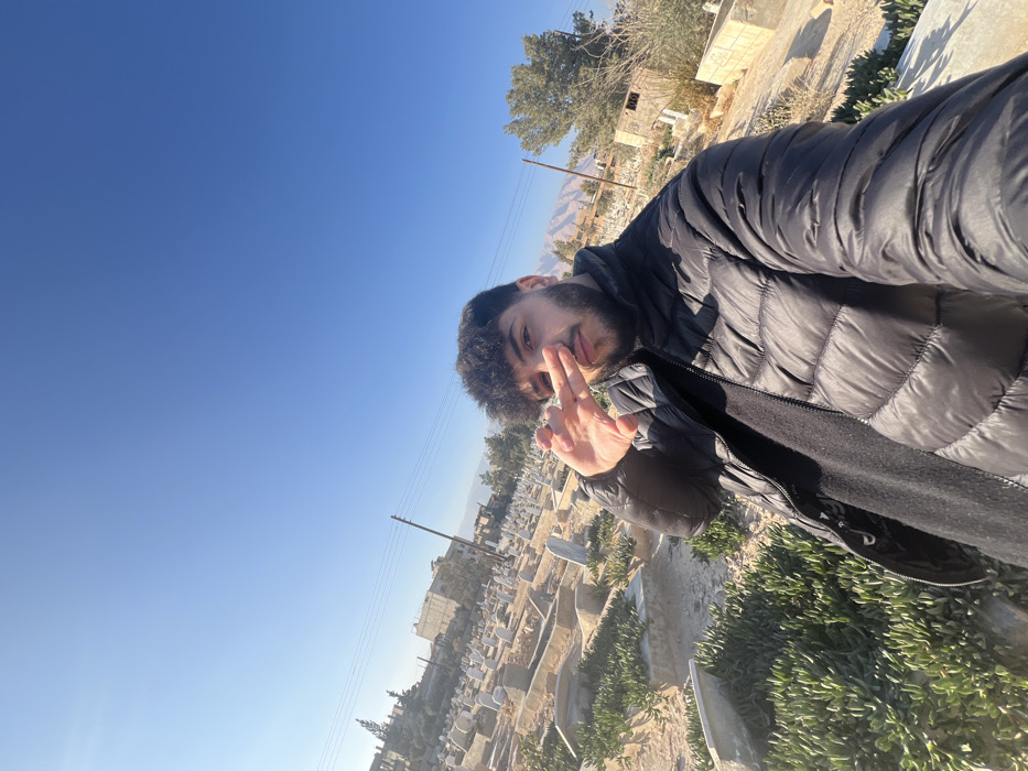 The image displays a young male taking a selfie in a cemetery located in Jirud, Syria, under a clear, bright blue sky