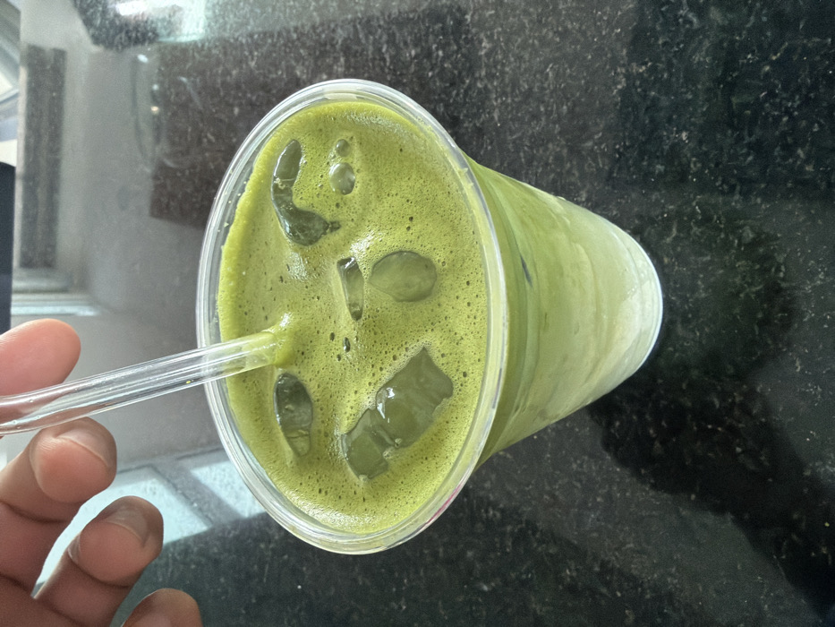 - "An overhead shot shows an iced matcha latte in a clear plastic cup on a dark, speckled surface" by FM-1pa2R2, licensed under CC BY 4.0