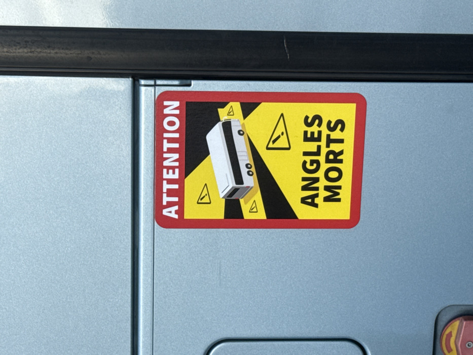 - "The image presents a close-up, forensically detailed view of a "ATTENTION ANGLES MORTS" (Attention Blind Spots) warning sticker affixed to the exterior of a light blue metallic vehicle panel" by FM-4PcBo1, licensed under CC BY 4.0