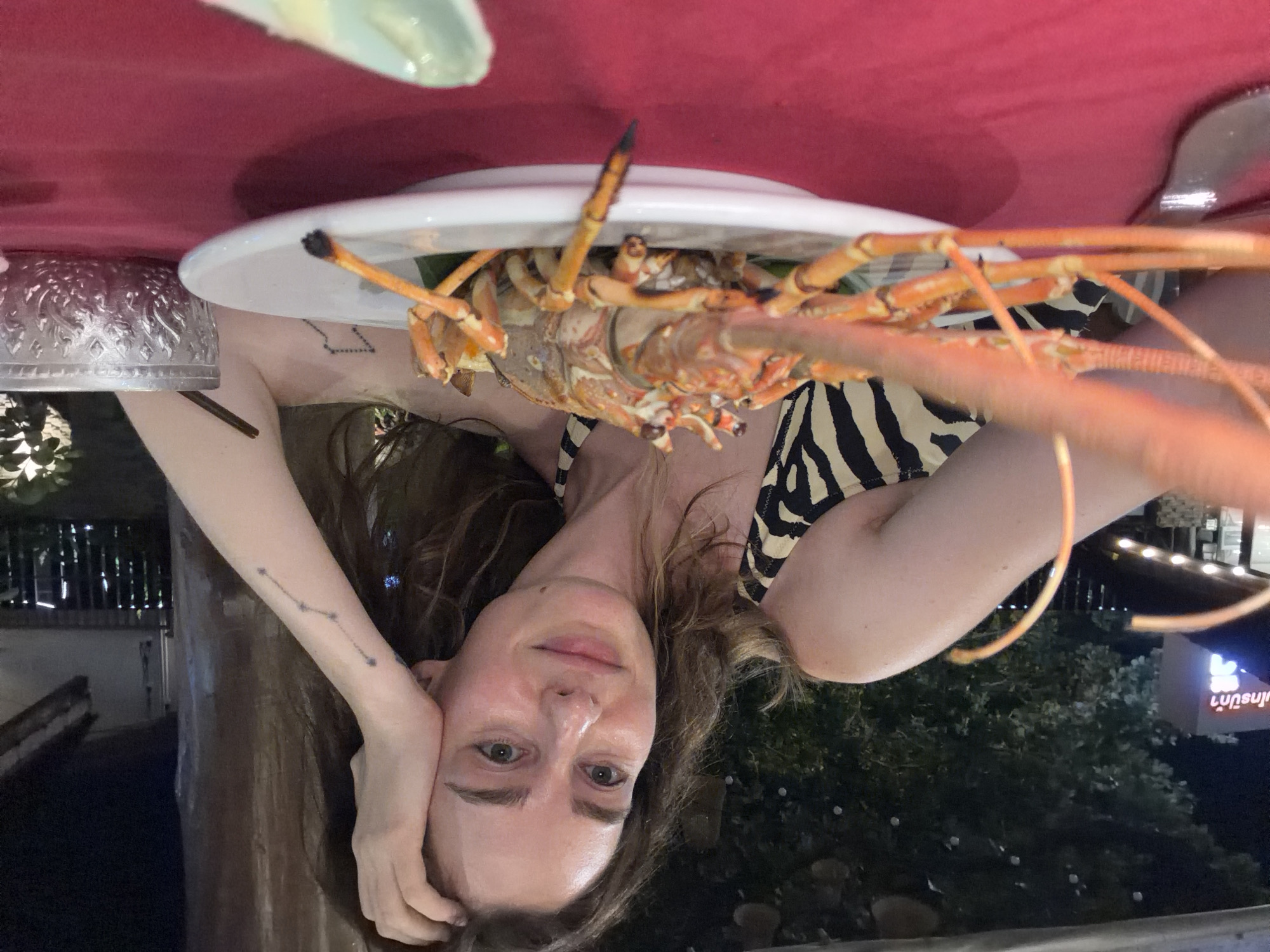 The image depicts a nighttime outdoor dining scene in Patong, Thailand. A young adult female with medium-length wavy brown hair and light eyes is seated at a table, looking directly at the camera with a slight smile. She is wearing a black and white striped top. Her left hand rests on her head, while her right forearm, bearing a tattoo resembling the Big Dipper constellation, is visible on the table. Centered on the deep red tablecloth is a white round plate holding a large, cooked rock lobster, which is reddish-orange and positioned over a green leaf garnish. A silver knife is partially visible to the left of the plate. To the right, an ornate silver bowl and a small light-green ceramic dish are present. The background, dimly lit, shows dark foliage with scattered lights, suggesting an outdoor or open-air restaurant environment. A white building with illuminated Thai script is visible on the far left, with the characters "ไกรป้า" (Krai Pa) partially discernible.