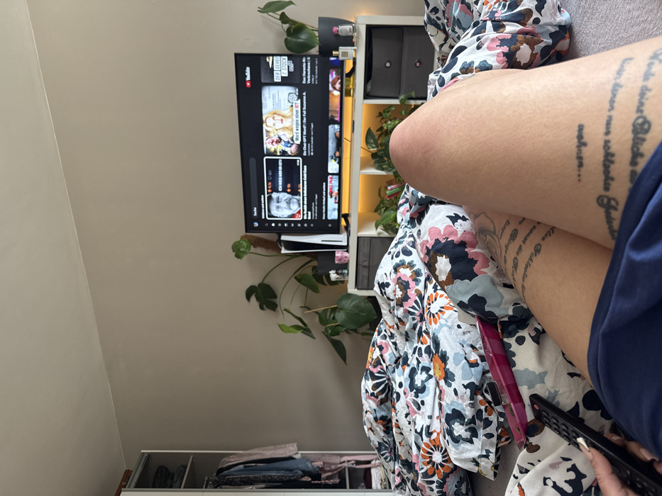 The image displays an indoor residential setting, likely a bedroom, captured from a reclining perspective on a bed. In the foreground, the lower legs of an individual are visible, clad in dark blue shorts, with both thighs exhibiting extensive dark-ink text tattoos in German. The person's right hand, with manicured fingernails, holds a black television remote control. The bed is covered by a duvet featuring a floral and abstract pattern in shades of blue, orange, pink, and white. Directly opposite the bed, a large flat-screen television is central, displaying the YouTube interface with German-language content. Visible video titles include "Wer war's bei einem unfassbaren Cold Case" and "Ein Chat-GPT Mord? Der Fall Susanne A.". The television rests on a white modular shelving unit that serves as a media console. A white PlayStation 5 console stands vertically to the left of the television. The shelving unit contains several potted green plants, including a large Monstera plant to the left of the TV and smaller plants within illuminated shelf compartments featuring warm-toned LED strip lighting. Dark gray storage boxes are placed in some of the shelf cubbies. Various small objects, possibly decorative items or personal care products, are also arranged on the shelves. To the far left, a white open wardrobe is visible, containing hanging clothes and folded garments. The walls of the room are painted a plain, light beige. The image itself does not contain any visual cues or identifiable landmarks to confirm a specific location within the city of Bad Nauheim, Germany. The German language content on the television is consistent with a location in Germany.
