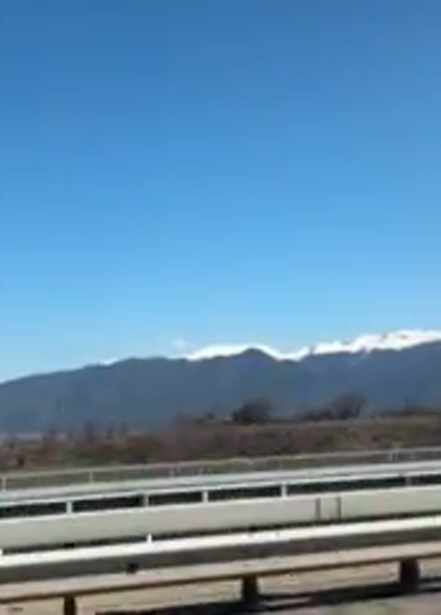 view from a moving vehicle driving on a highway. A car passes in the opposite direction. In the distance, there are mountains with snow-capped peaks under a clear blue sky. The landscape between the road and the mountains is brown and appears to be somewhat barren. The highway has a metal guardrail. The video appears to be taken during daylight hours.