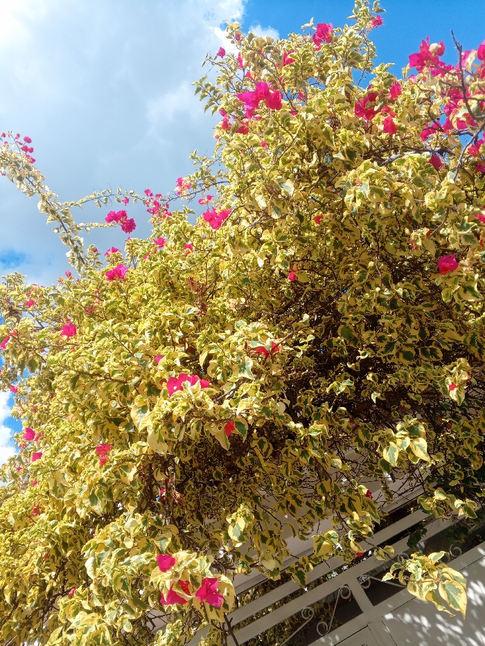 - "A bougainvillea climbs against a white fence, reaching towards a bright blue sky with scattered clouds" by FM-67jFM2, licensed under CC BY 4.0