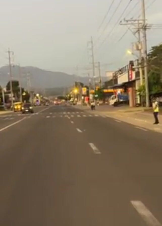 A wide shot shows a road running directly away from the viewer, under a cloudy sky