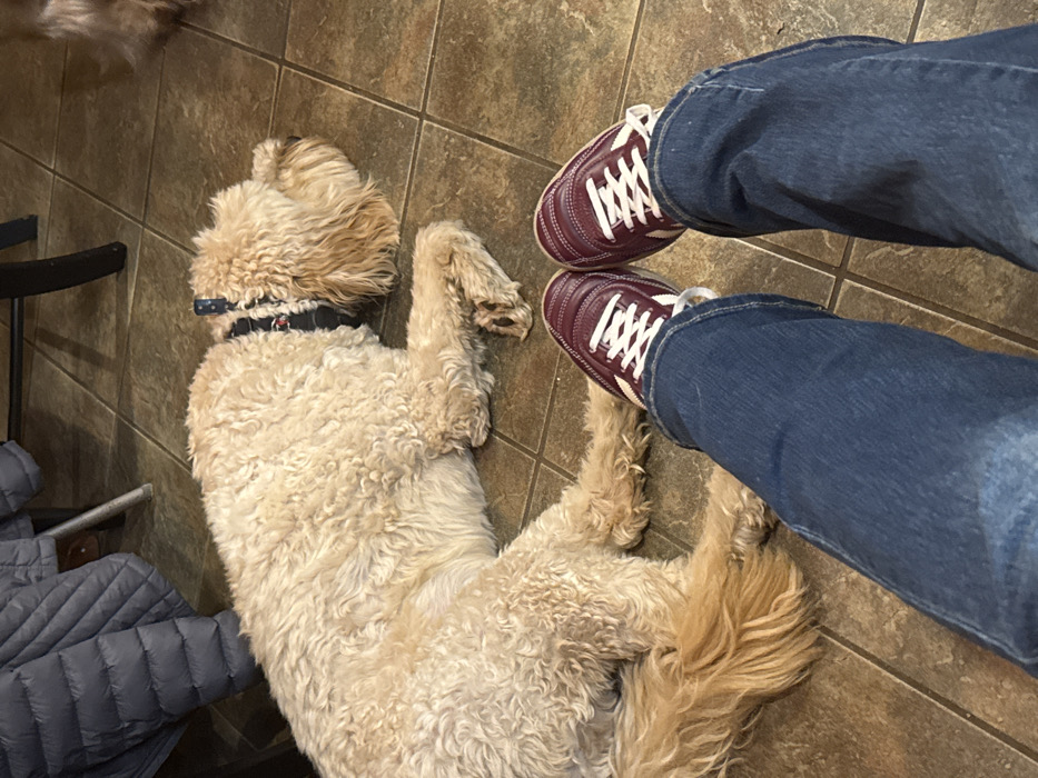 An overhead shot features a golden doodle lying on its back on brown tiled flooring, with its legs splayed out. The dog wears a black collar. Next to the dog are a pair of legs clad in blue jeans and burgundy sneakers with white laces and stripes. A dark chair leg is partially visible on the left, along with a quilted gray jacket. A blurry patch of fur appears in the upper left corner, hinting at another animal.