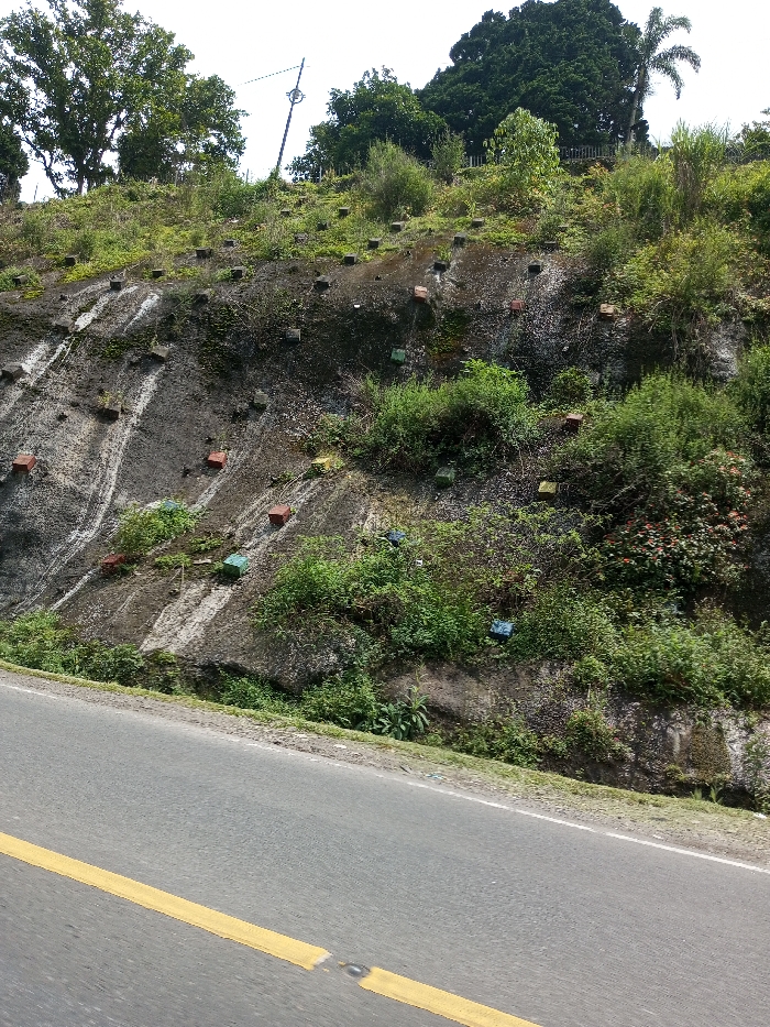 The scene, located in Vieng Phouka, Laos, depicts a section of an asphalt road running parallel to a steep, rocky embankment. The road in the foreground features a solid yellow line on the left, indicating a no-passing zone, and a white line marking the shoulder on the right. The embankment, occupying the midground and background, is characterized by a grey, uneven rock and soil surface. Numerous small, approximately cubic or rectangular objects, colored reddish-brown, green, blue, and yellow, are irregularly embedded into the face of the embankment, consistent with visible soil nail heads or anchors used for slope stabilization. Sparse to moderate green vegetation, including shrubs, bushes, and grasses, grows across the embankment's surface. At the crest of the hill, dense green trees are visible, along with a solitary palm tree towards the upper right and a utility pole with crossarms on the upper left. The scene is brightly illuminated, indicating daylight. No individuals, animals, or vehicles are present.