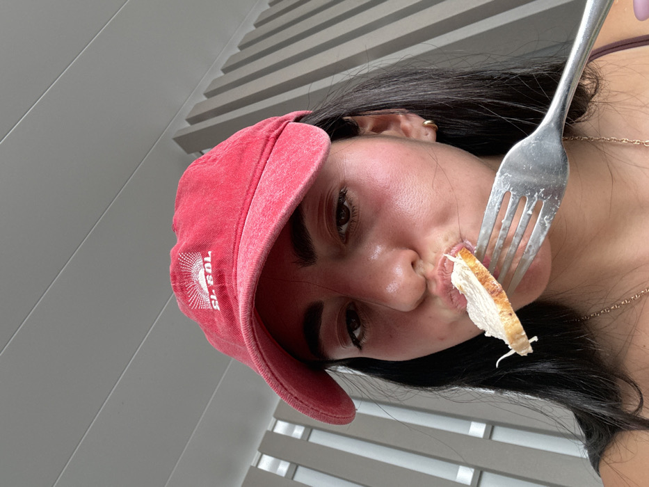 The image presents a close-up, head-and-shoulders view of a female individual in the city of Unknown, Bahamas, in the act of eating