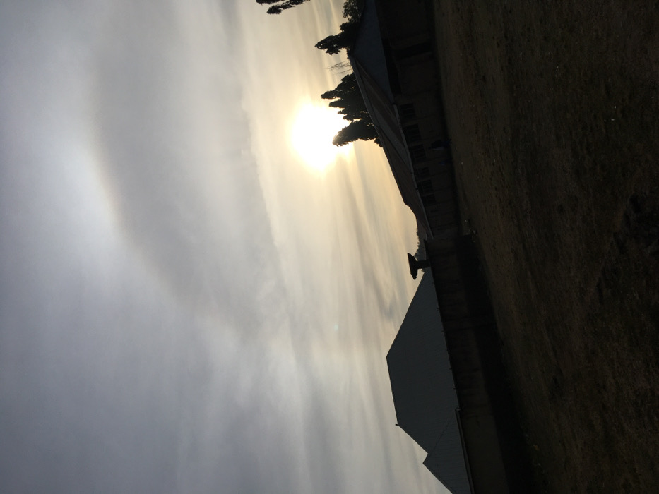 A landscape scene presents a low-angle view toward the sun, obscured by thin clouds