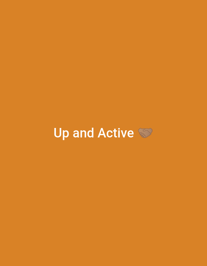 A golden-orange background displays the text "Up and Active" in white, centered. A handshake emoji with skin tones of brown and beige appears to the right of the phrase. The text and emoji are placed in the middle of the frame.