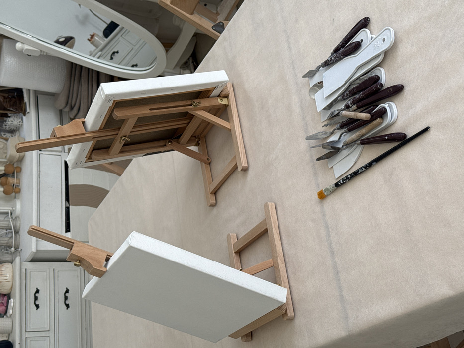 The scene depicts an interior room in Tel-Aviv, Israel, arranged for artistic work. A large table, covered with a light beige or off-white fabric, occupies the foreground and midground. Two small, light-colored wooden tabletop easels are positioned on this table. The easel on the left holds a blank, vertically oriented white canvas. The easel on the right is situated further back and displays a second white canvas, with its reverse side and wooden support frame visible. In the lower right portion of the table, a collection of art tools is laid out. This group consists of approximately ten to twelve palette knives and scrapers; some have metal blades and dark, possibly wooden, handles, while others are entirely white plastic. These tools exhibit visible residue, consistent with prior use. A single paintbrush, featuring a black handle and a worn yellow-tipped bristle head, lies horizontally among the palette knives. The background reveals light-toned furniture. To the left, a white dresser with two drawers and dark pull handles is visible, topped with various small, light-colored decorative items. To the right, a large, cream-framed mirror with an oval shape stands, reflecting parts of the room, including what appears to be stacked textiles or blankets. No individuals are present in the image.