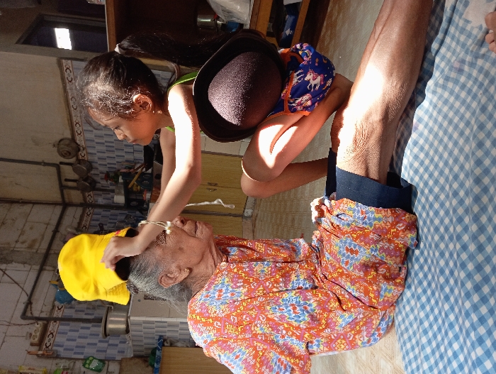 - "A young girl places a yellow hat on the head of an elderly woman who is seated and wearing an orange and blue floral shirt" by FM-TnUEx2, licensed under CC BY 4.0