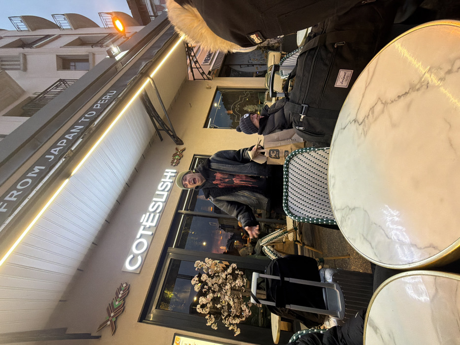 The image depicts an outdoor café seating area in front of the "COTÊS SUSHI" restaurant at 10 Rue Royale, Annecy, France. The scene occurs during what appears to be late afternoon or early evening, under an overcast sky, with artificial lighting active. In the mid-ground, a male subject stands facing the camera, positioned between two café tables. He wears a dark, shearling-lined jacket, a dark hoodie with a red graphic design, and a green beanie. His mouth is wide open, suggesting vocalization, and his arms are slightly extended forward. In his left hand, he holds a brown paper bag bearing the "COTÊS" logo. To his right, a second male subject is seated at a café table, wearing a dark puffer jacket and a dark beanie. He is smiling and looking towards the standing man. A large black duffel bag with "Lansquenet" printed on it rests on a chair next to him. A third individual, partially visible on the far right, shows only a fur-lined hood and a shoulder with a "Schott" logo. The foreground features two round café tables with white marble tops and gold-colored rims, one positioned closer to the viewer and partially obscuring the lower right. A black rolling suitcase with a silver handle is visible to the left of the standing man. The "COTÊS SUSHI" restaurant facade is visible behind the individuals, featuring glass doors and bright white neon signage. An artificial cherry blossom tree is positioned to the left of the entrance. Above the restaurant, an illuminated awning displays the text "FROM JAPAN TO PERU". The background shows a multi-story building with balconies and windows. A street lamp with an orange glow is visible on the upper right side of the frame.
