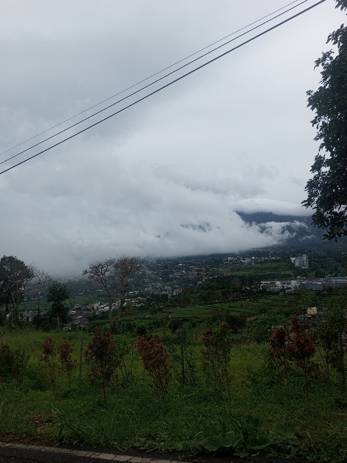The image displays a panoramic view of Babaliya Mal., India, under an overcast sky with significant cloud cover and fog. In the foreground, a dark, paved surface, likely a road or path edge, runs along the bottom of the frame, bordered by a strip of green grass and various low-lying plants. Several small bushes with reddish-brown foliage are interspersed within this vegetation. To the left, two prominent deciduous trees with light-colored bark and sparse branches stand. The midground reveals a densely populated urban area, comprising numerous multi-story buildings, predominantly light-toned, spread across undulating terrain and lower hillsides. Patches of green vegetation, possibly cultivated fields or natural slopes, are visible between clusters of structures. In the background, large mountain formations are heavily obscured by thick, low-hanging white and grey clouds or fog, which partially envelop the upper sections of the town. Two parallel, dark utility cables traverse the upper left quadrant of the sky. On the far right edge, a section of a tree with dark green foliage frames part of the scene. No individuals or specific actions are discernible. The lighting is diffused, consistent with an overcast day.