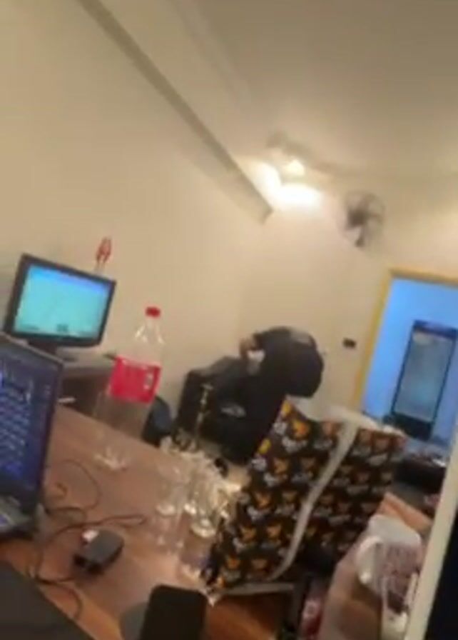 The camera tilts down to show a room with a messy wooden table and a person slouching in a black chair against a wall. The person is wearing dark clothing. On the table, there is a partially opened bag of "DQ" chips, several empty glasses, a cell phone, a vape pen, and a computer monitor. To the left, a television screen is visible, and a bottle of Coca-Cola sits on a nearby table. An electric fan is mounted on the wall. In the background, a doorway reveals another room with blue-painted walls.