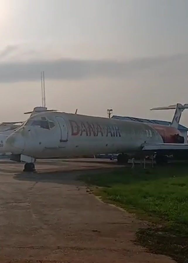 n exterior shot of several parked airplanes on a concrete runway. The planes are a mix of sizes and colors. One plane, marked "DANA AIR," is partially obscured by overgrown grass. The other planes are primarily white with different colored markings. The sky is overcast, and the sun is visible but hazy. There are light poles and buildings in the background. No people are visible. The camera pans slowly across the scene.