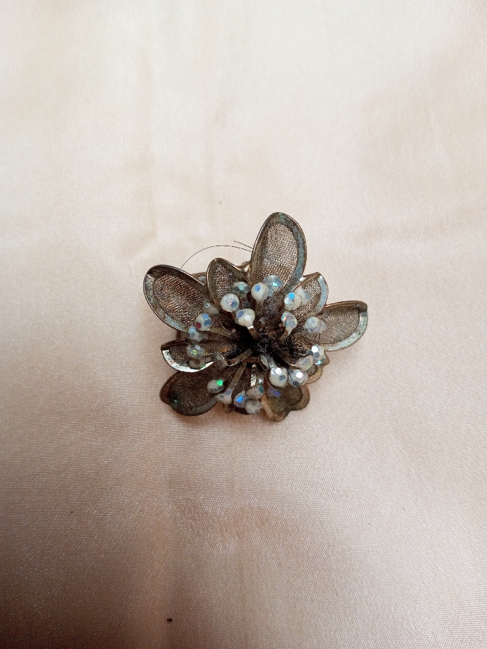 - "A single metallic brooch, designed in a floral motif, is depicted resting on a light, subtly textured fabric surface" by FM-tIznO2, licensed under CC BY 4.0