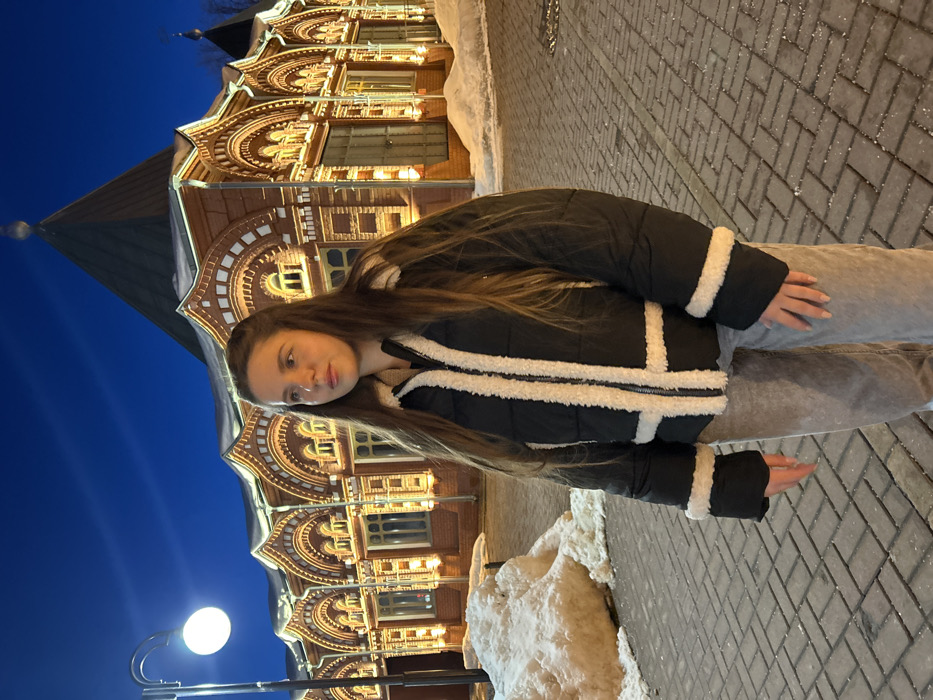 The image displays an outdoor evening scene in Klin, Russia, featuring a single female subject positioned on a paved area in front of the illuminated Gostiny Dvor building