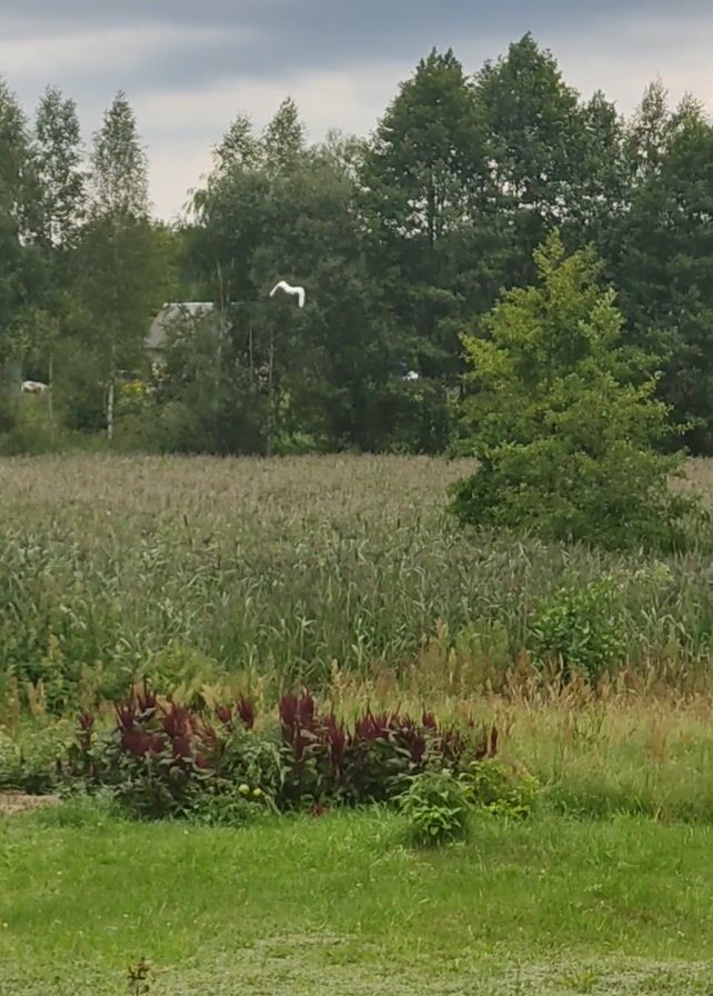 lush green landscape. On the left side, a dense forest area is visible, with trees of varying heights and shades of green. Adjacent to the forest is a field of tall, dry grass or reeds, suggesting a marshy or uncultivated area. The right side of the frame is dominated by a well-maintained lawn, with shorter grass. In the middle of the frame, there is a small plot of darker red plants in a line. A white bird flies through the scene, briefly appearing against the backdrop of trees. The sky is overcast with dark clouds. The camera appears to be held in a vertical position.
