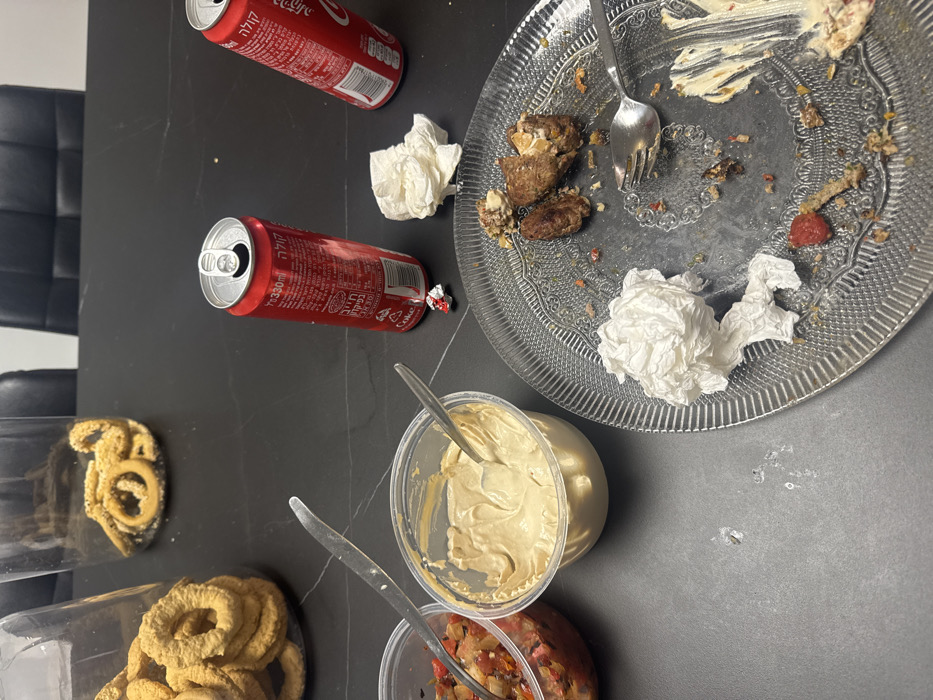 The image depicts an indoor scene on a black table in Holon, Israel, presenting items consistent with a recently used dining area