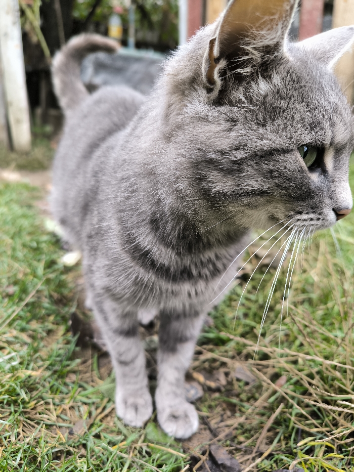- "A gray tabby cat stands on sparse green and brown grass in Parkhomivka, Ukraine" by FM-dWhzM2, licensed under CC BY 4.0