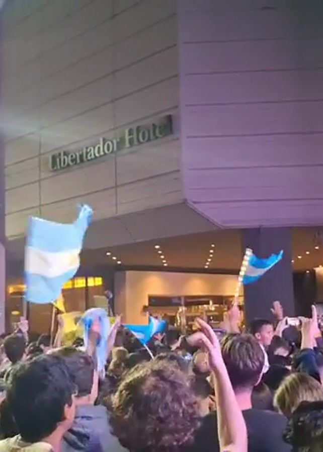 A nighttime crowd is gathered in front of the Libertador Hotel, waving Argentinian flags. People are holding up phones to take pictures. The hotel has a modern facade and is brightly lit at the entrance. The crowd appears celebratory and excited.