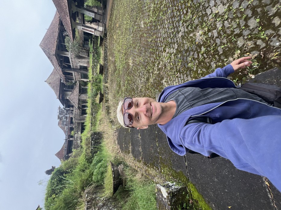 An adult male with fair skin, light-colored hair, and sunglasses perched on his head smiles directly at the camera, holding a device in his outstretched right hand to take a selfie. He is wearing a dark grey striped t-shirt under an open blue zippered hoodie. He stands on an outdoor paved area composed of interlocking grey pavers heavily overgrown with green weeds and moss. To his left, a cracked concrete path with moss leads towards a raised area of dense green vegetation. In the mid-ground, multiple concrete planters, some containing overgrown grass, are visible. The background features a large, abandoned building complex with traditional Indonesian architectural elements, including prominent tiled roofs with multiple gables and visible structural decay. The buildings exhibit missing windows, weathered surfaces, and significant encroachment by green vegetation. The sky above is uniformly overcast. The scene is located in the city of Mekarsari, Indonesia.