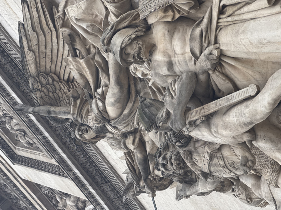 - "The image displays a detailed, upward-angled view of a weathered limestone relief sculpture, identified as "La Marseillaise" (The Departure of the Volunteers of 1792) by François Rude, located on the Arc de Triomphe in Paris, France" by FM-QhCsg2, licensed under CC BY 4.0