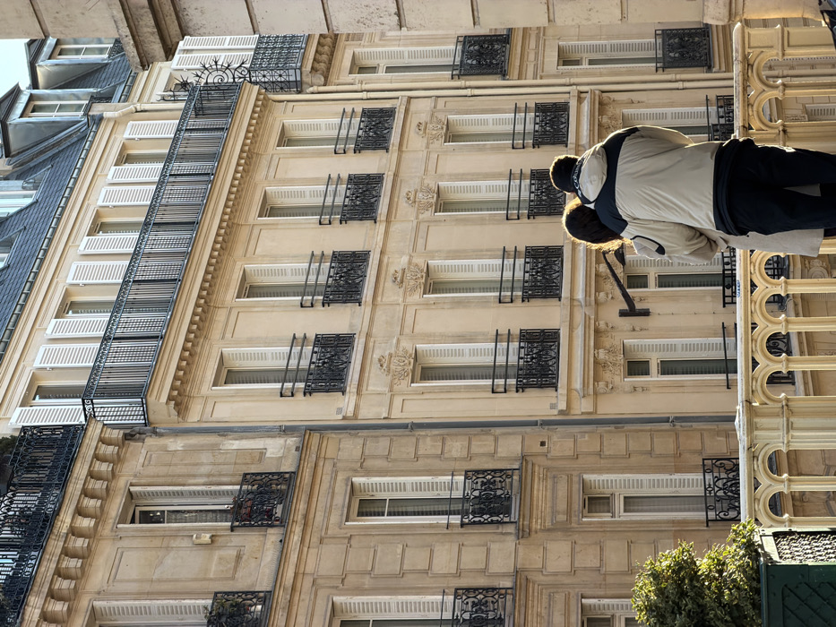 - "Two individuals, a man and a woman, stand with their backs to the viewer on a white ornate balustrade balcony overlooking a street in Paris, France" by FM-YL2yX2, licensed under CC BY 4.0