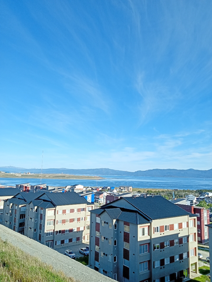 A scenic view showcases a cityscape with modern apartment buildings under a clear blue sky. The buildings feature gray exteriors, dark roofs, and symmetrical window arrangements. A body of water extends towards a distant landmass, framed by rolling hills. A tall antenna pierces the horizon. The grassy foreground leads to the buildings, suggesting a slightly elevated vantage point.